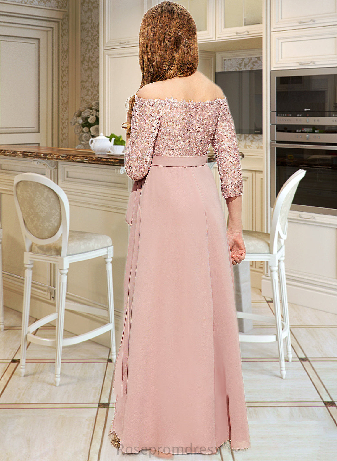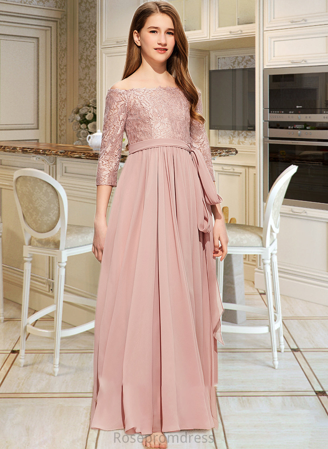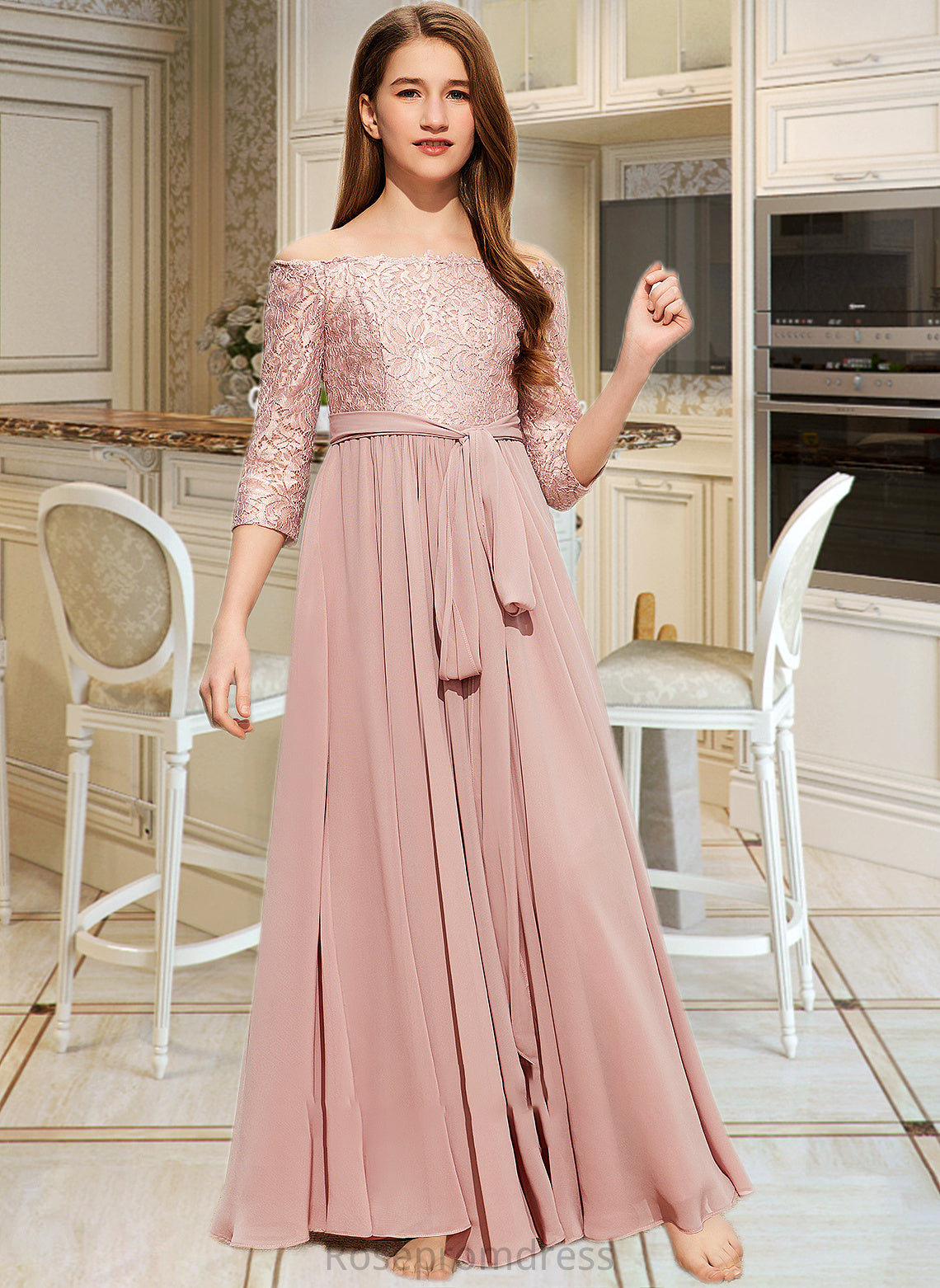 Yasmin A-Line Off-the-Shoulder Floor-Length Chiffon Lace Junior Bridesmaid Dress With Bow(s) SRSP0013658